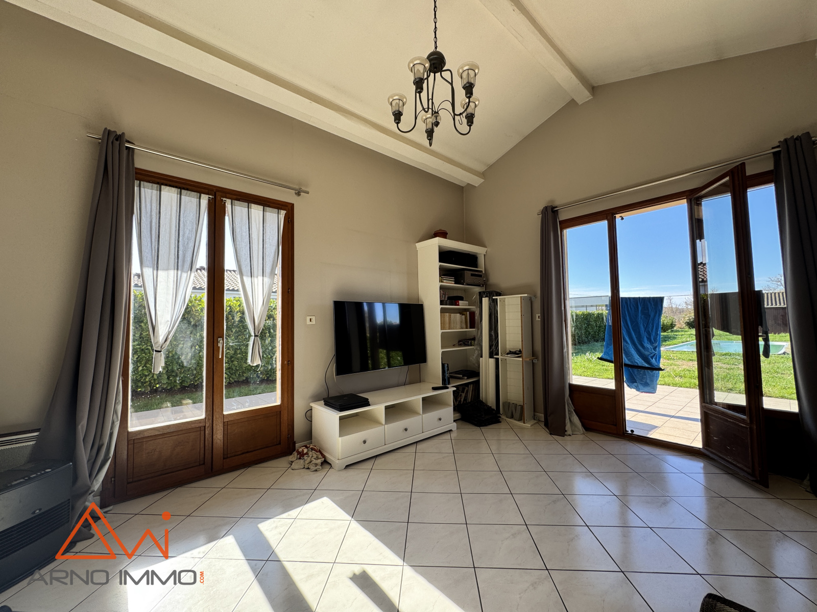 À l’extérieur, la piscine au chlore, dont les abords restent à finaliser selon vos envies, s’intègre parfaitement dans cet environnement verdoyant et bien exposé.