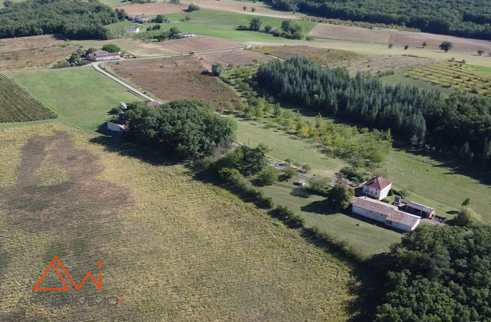 Terres d'un seul tenant d'environ 7 hectares de prés, de bois de differentes essences et d'une plantation de noyers.